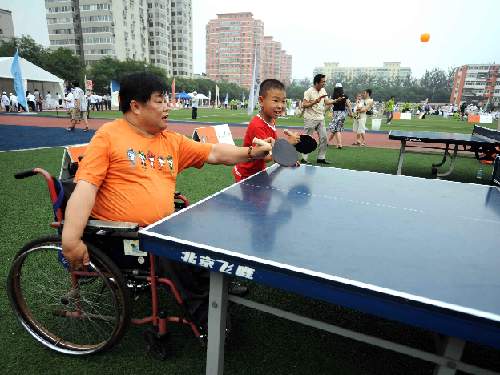 6月28日,社區(qū)小朋友在體驗(yàn)殘奧項(xiàng)目坐式排球運(yùn)動(dòng)。當(dāng)日,北京奧運(yùn)會(huì)獎(jiǎng)牌贊助商必和必拓公司在北京舉辦了奧運(yùn)社區(qū)行活動(dòng),少年兒童和他們的父母在專業(yè)體育教練的指導(dǎo)下體驗(yàn)了多個(gè)奧運(yùn)會(huì)和殘奧會(huì)體育項(xiàng)目。 新華社記者羅曉光攝