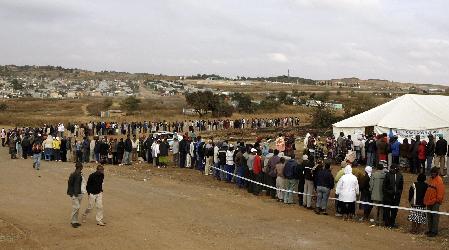 當(dāng)?shù)貢r間4月22日上午,眾多南非選民在投票站外排隊參加投票