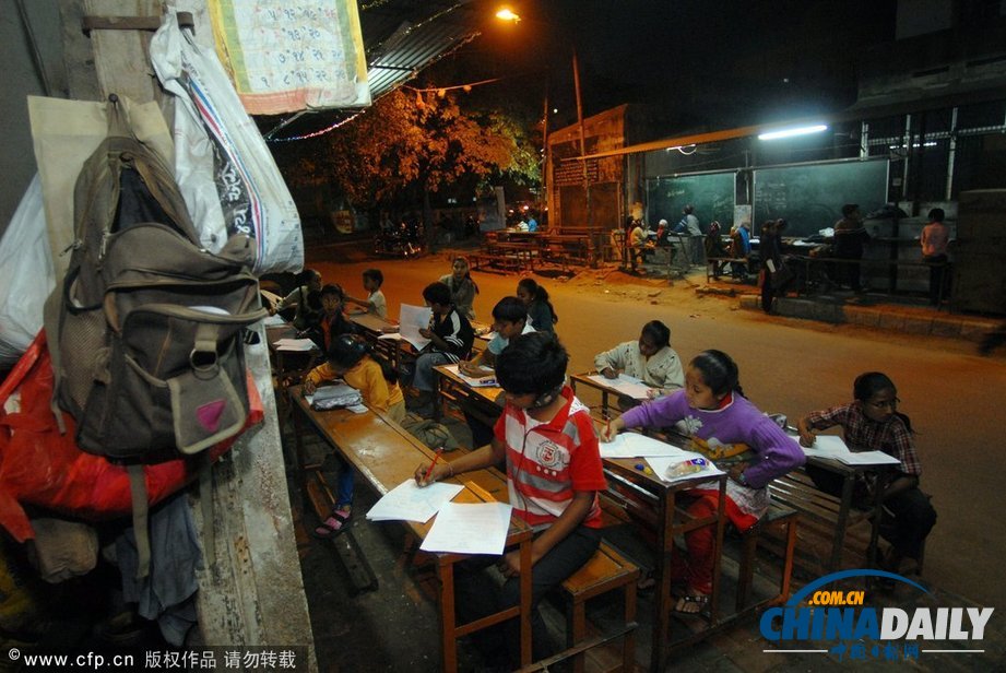 2012年2月4日,印度Ahmedabad,一所設(shè)立在人行道上的課堂,學(xué)生們?cè)诖诉M(jìn)行學(xué)習(xí)。這所學(xué)校是由現(xiàn)年64歲的Kamal Parmar開(kāi)設(shè)的,主要利用晚間時(shí)間,教授附近貧民窟中的小學(xué)生們。學(xué)校已經(jīng)開(kāi)設(shè)了超過(guò)12年。根據(jù)印度工商業(yè)聯(lián)合會(huì)所的調(diào)查,在印度,教育花費(fèi)增長(zhǎng)同每年的通貨膨脹率持平。在過(guò)去的6年中,家長(zhǎng)的收入平均增長(zhǎng)了40%,但是教育成本則同期增長(zhǎng)了200%。85%的學(xué)生家長(zhǎng)需要花費(fèi)超過(guò)一半的收入,投入到子女的教育上,子女教育成為家庭的主要負(fù)擔(dān)。