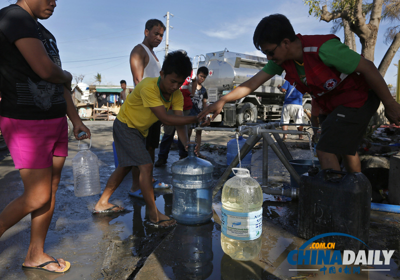 當地時間2013年11月14日,菲律賓塔克洛班,紅十字會工作人員將清水給災民。據菲律賓社會福利部提供的數據,強臺風“海燕”侵襲菲律賓造成的遇難人數是4460人,另有92萬人流離失所,災民人數總計達1180萬人。(圖片:東方IC)