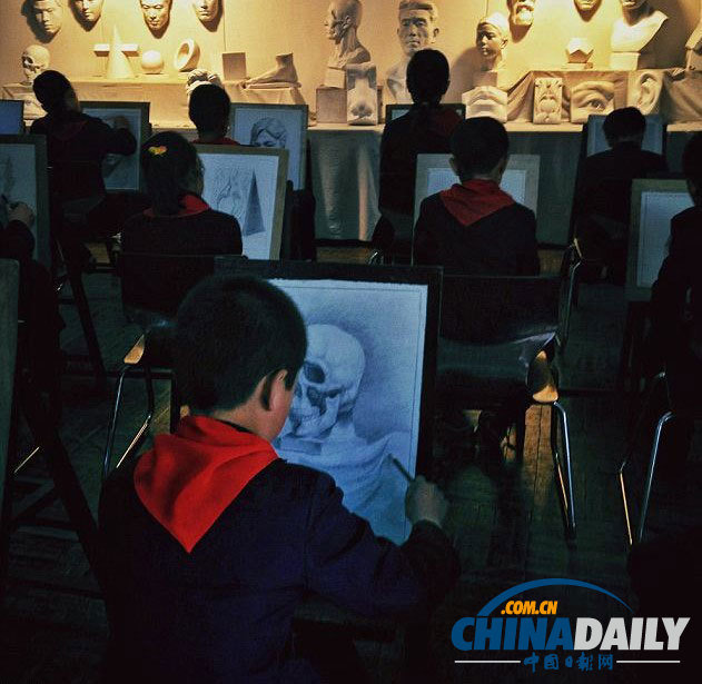 這是一名朝鮮平壤的學(xué)生在美術(shù)課堂上寫生,畫的是一個骷髏。(圖片來源:美國媒體)