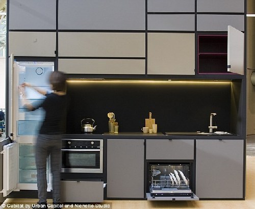 立方體小屋的一面設有廚房,里面設備齊全:水槽、烤箱、灶臺、洗碗機、冰箱和櫥柜。