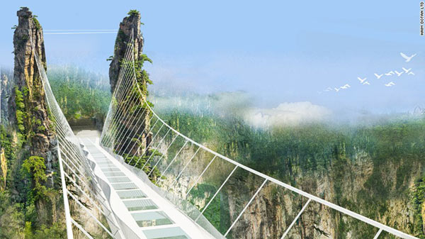 Set against dramatic landscapes in Zhangjiajie National Forest Park, the bridge is 430 meters long, six meters wide and hovers over a 300-meter vertical drop.