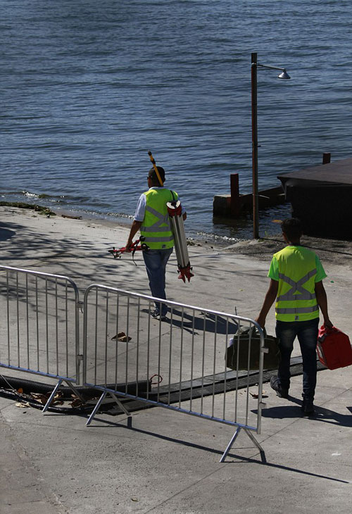 記者無法到達(dá)看臺,但可以通過場館后方一個無人看守的停車場靠近碼頭。
