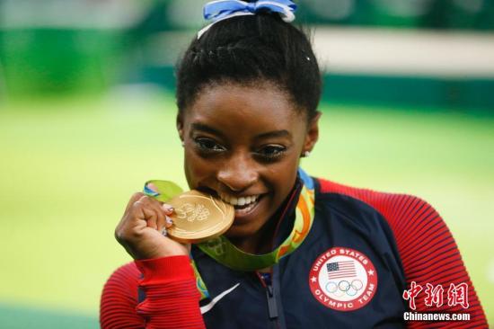 當(dāng)?shù)貢r間時間8月11日,2016里約奧運女子體操個人全能比賽,美國名將拜爾斯奪得冠軍。圖為拜爾斯咬金牌慶祝。中新網(wǎng)記者 杜洋 攝