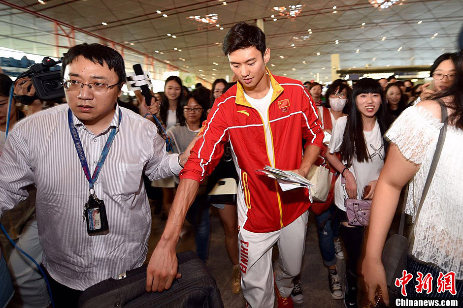 北京時間8月16日清晨,里約奧運中國游泳隊回國抵達(dá)北京機場,傅園慧、寧澤濤等游泳選手被媒體和粉絲包圍。圖為寧澤濤抵達(dá)首都機場。中新網(wǎng)記者 金碩 攝