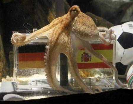 Two year-old octopus Paul, the so-called "octopus oracle" predicts Spain's victory in their 2010 World Cup semi-final soccer match against Germany by choosing a mussel, from a glass box decorated with the Spanish national flag instead of a glass box with the German flag, at the Sea Life Aquarium in the western German city of Oberhausen July 6, 2010.(Agencies) |