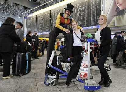 The clowns, outfitted in brightly coloured costumes and some parading on stilts, started working over the weekend, when heavy snowfall led to hundreds of flights being scrapped amid chaos in the European air traffic network.