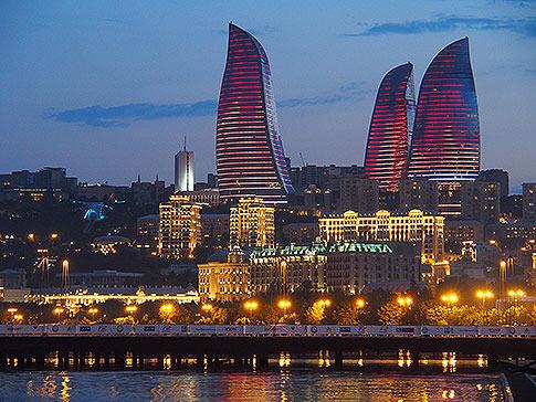 6. Flame Towers, Baku, Azerbaijan These towers are completely covered with LED screens displaying the movement of fire and creating the effect of giant torches. The design was inspired by Azerbaijan’s history as a land of fire due to its rich deposits of natural gas.
