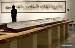 A visitor views an exhibit in the Chinese long painting exhibition at Zhejiang Art Museum in Hangzhou, capital of east China's Zhejiang province, Dec 26, 2012. The "Chinese Long Painting World - Hangzhou Chinese Painting Biennale" kicked off here on Wednesday. Over 100 Chinese long painting works of 30 painters were displayed during the exhibition. Chinese long painting is a traditional form of Chinese painting, using long canvas to depict landscape, birds, flowers and human figures.[Photo/Xinhua] |