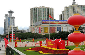 To celebrate the 19th National Congress of the Communist Party of China, the Wuyi Square, a landmark in Fuzhou, provincial capital of South China's Fujian province has been given a facelift with decorations of red lanterns, flowers and national flags