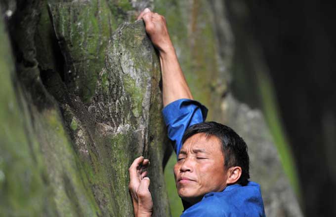 With bare hands, no safety ropes and loosely laced canvas sneakers on his feet, Huang Xiaobao, a 52-year-old villager clambers up the sheer rock face of cliffs along Getu River in Southwest China's Guizhou province.