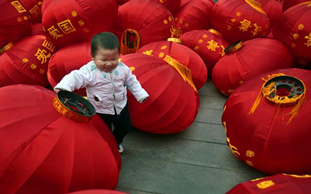 A child plays amid red lanterns in Guiyang, Southwest China's Guizhou province,on Jan 30, 2016, to greet the upcoming Chinese Spring Festival.[