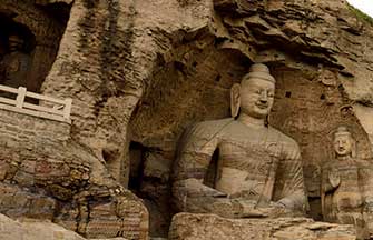 Many of my group had lost sight of each other when we entered the Imperial Grotto Temple, fashioned like a fortress but lustered with gold-colored facsimiles of spiritual deities to please the mass of tourists making pilgrimages to Shanxi's famed site for prayer.
