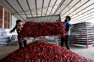 Staff members of Xinhengyuan Traditional Chinese Medicine Co aired chilies in Zhaoxiong village, Zhaokang town, Xiangfen county, Linfen city, Shanxi province, Nov 14.