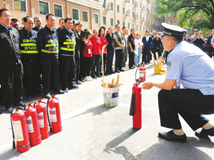 Nanneihuaner Community in Yingze district, Taiyuan, along with the local fire brigade, visited local firms to promote fire safety and teach firefighting techniques, May 22.