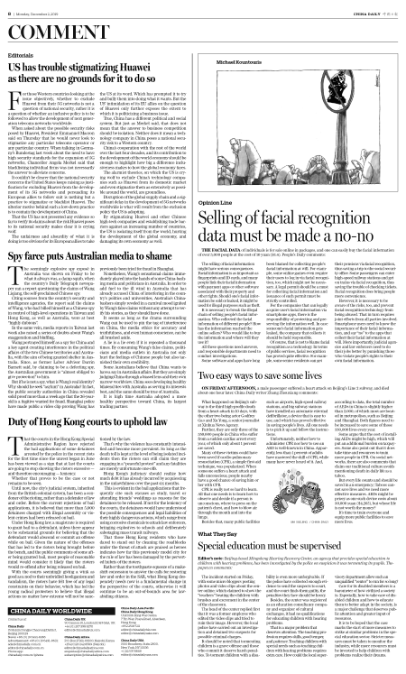 THE FACIAL DATA of individuals is for sale online in packages, and one can easily buy the facial information of over 5,000 people at the cost of 10 yuan ($1.4). People's Daily comments: