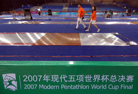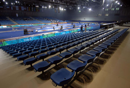 Newly-completed fencing strips are seen in the Fencing Hall, National Conference Center, Olympic Green in this picture taken on September 13, 2007. [Xinhua]