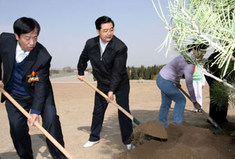 President Hu Jintao (C) shovels soil to a tree at the Beijing Olympic Forest Park to mark the capital's 23rd tree-planting day as well the launching of the country's first "Green China Day" on Sunday, April 1, 2007. Each year, the leaders take part in the national tree-planting campaign to make the country greener. [Xinhua]