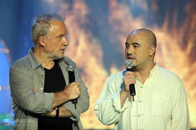 Italian music producer Giorgio Moroder (L) and Chinese pianist Kong Xiangdong at the recording of "Forever Friends." They are working together to compete for the 2008 Beijing Olympics theme song in Beijing on Tuesday, August 7, 2007. [sina.com]