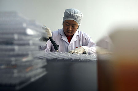 A laboratory assistant checks poultry samples at a chicken processing plant on the outskirts of Beijing November 12, 2007. All supplies to athletes, trainers and coaches will be scrutinized in a tracking system, which monitors food production, processing and delivery as well as hygiene conditions. [Agencies] |