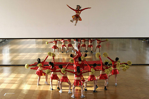 Cheerleaders rehearse at a gymnasium in Tianjin municipality January 4, 2008. The team will attend trials to compete for a chance at performing in the upcoming 2008 Beijing Olympic Games. [Agencies]