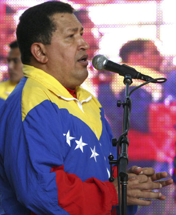 Venezuela's President Hugo Chavez speaks to the national team volleyball players in Caracas January 9, 2008 after they qualified for the Beijing Olympic Games. [Agencies]
