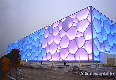 A photographer takes pictures near the National Aquatics Centre, also known as the Water Cube, which is lit by lights at night in Beijing January 20,2008. The centre, built for the Beijing Olympics, will host its first event - the "Good Luck Beijing" Swimming China Open - from January 31 to February 5.[Asianewsphoto]