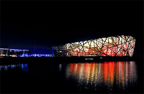 The National Stadium, or "Bird's Nest" is lit in colors at night and reflected in the water in Beijing, March 3, 2008.Managers of the 91,000-seat arena, which will host the opening and closing ceremonies at the summer Games, began trials on lighting the stadium. [Xinhua]