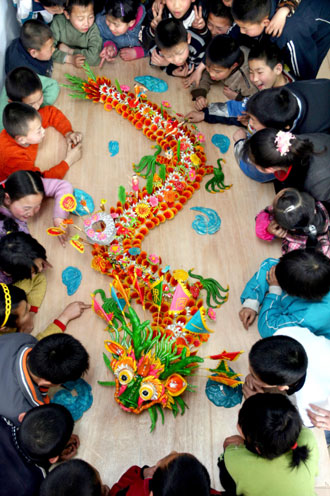 Students from the Chengguan primary school in Wanrong county, Shanxi province, marvel at a flour-dough dragon yesterday. A teacher made and decorated it with Olympic icons to inspire student's interest in the Games. [Xinhua]