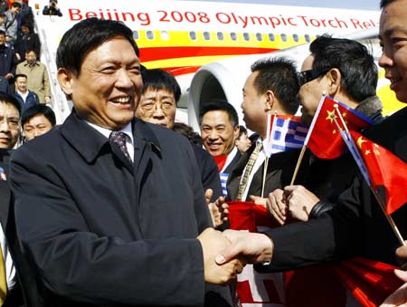 Liu Qi(front L), president of the Beijing Organizing Committee for the Games of the XXIX Olympiad (BOCOG), also the Communist Party of China chief of Beijing, arrives in Athens of Greece on March 29, 2008. [Xinhua]