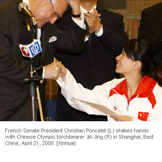 French Senate President Christian Poncelet (L) reads President Nicolas Sarkozy's sympathy note to Chinese torchbearer Jin Jing (front R) in Shanghai, East China, April 21, 2008. [Xinhua]