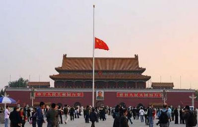 China's national flag flies at half-mast at Tiananmen Square in central Beijing, May 19, 2008. [Agencies]