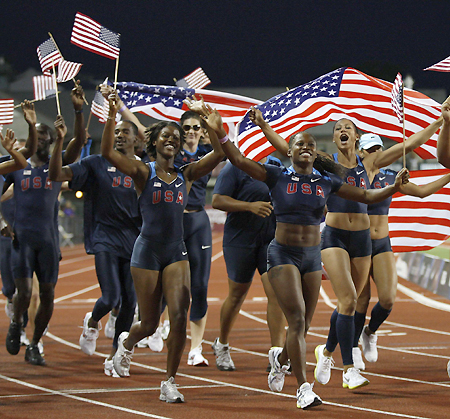 Members of the US Olympic Track and Field team, including sprinter Lauryn Williams, heptathlete Hyleas Fountain and shot putter Reese Hoffman, model the uniforms they will wear at the Beijing Olympics after they were unveiled at the US Olympic Track and Field Trials in Eugene, Oregon June 30, 2008. [Agencies] Basketball Uniforms