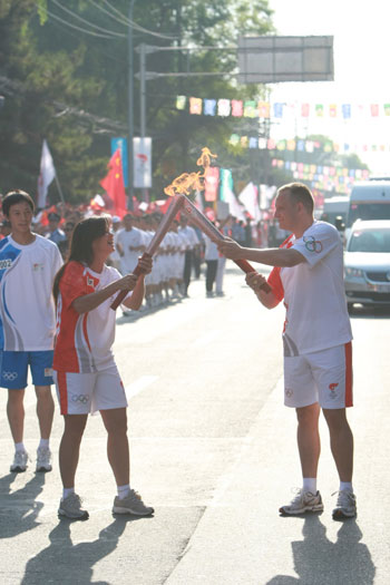 Deirdre Smyth Brady from Venezuela (left) gets her torch lit from another bearer.