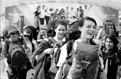 Tourists arrive at Beijing's airport on Monday. More than half a million overseas visitors are expected for the Games. [China Daily]