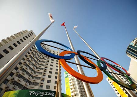Flags are seen at the Huiyuan Apartment Media Village in Beijing, July 29, 2008. [Xinhua]