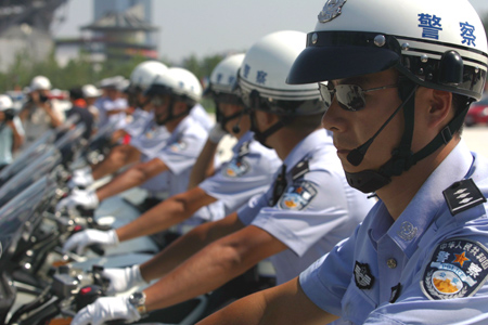 Traffic plice attend the launch ceremony of a traffic photography competition in Beijing, August 3, 2008. The contest, jointly conducted by China Daily, Beijing Traffic Management Bureau and Beijing Photographers Association, is aimed to showcase Beijing's advanced traffic control methods and promote safe road traffic during Olympics. [Jiang Dong/China Daily]