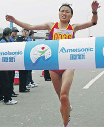 Zhou Chunxiu passes the finishing line as she wins the Xiamen Marathon in 2003. [China Daily]