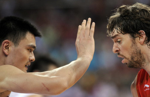 China's Yao Ming (L) vies with Spain's Pau Gasol during a men's preliminary round group B basketball match at the Olympic Basketball Arena in Beijing on August 12, 2008. [Agencies]