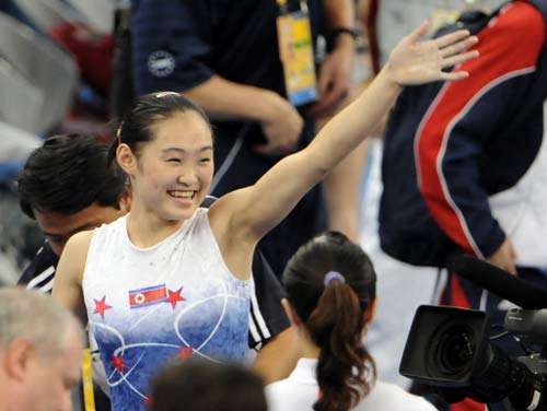 North Korea's Hong Un-jong (L) waves after winning the gold in the women's vault final of the artistic gymnastics event of the Beijing 2008 Olympic Games in Beijing on August 17, 2008. North Korea's Hong Un-jong won the gold, Germany's Oksana Aleksandrovna Chusovitina the silver and China's Cheng Fei the bronze. [Agencies]