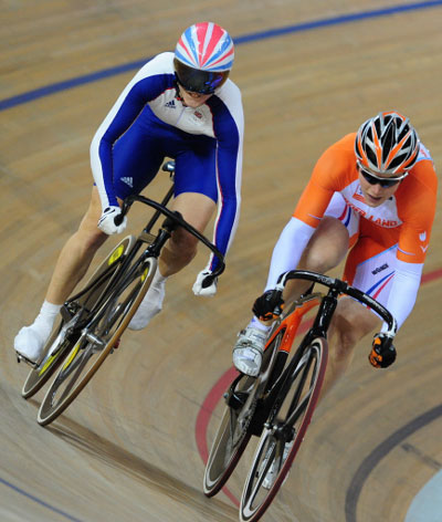 Track cyclists Victoria Pendelton (L) of Great Britain and Willy Kanis of the Netherlands compete in the 2008 Beijing Olympic Games women's sprint semifinals at the Laoshan Velodrome in Beijing on August 19, 2008.[Agencies]