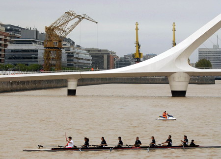The Olympic torch is carried by rower Santiago Hernandez in the River Plate as it continues its relay through Buenos Aires April 11, 2008. [Xinhua]