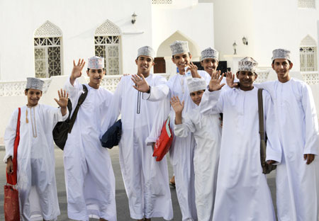 Local students say hello to the Olympic flame in the Omani capital of Muscat, April 14, 2008. The Beijing Olympic torch run in Muscat is due to begin on Monday. [Xinhua]