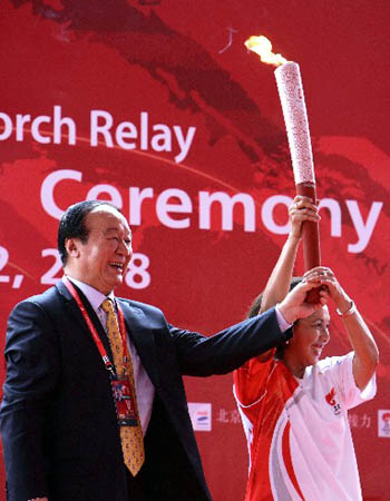 Jiang Xiaoyu (L), vice president of the Beijing Organizing Committee of Olympic Games (BOCOG), hands over the torch, which was kindled with the sacred Olympic flame from ancient Olympia of Greece, to Rita Subowo, president of the National Olympic Committee of Indonesia. [Xinhua]
