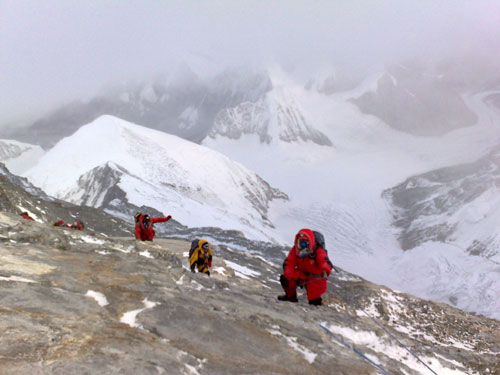 Chinese climbers carrying the Olympic flame scale the summit of Mt. Qomolangma on Thursday morning. The torch arrived at the summit at around 09:17. [Xinhua]
