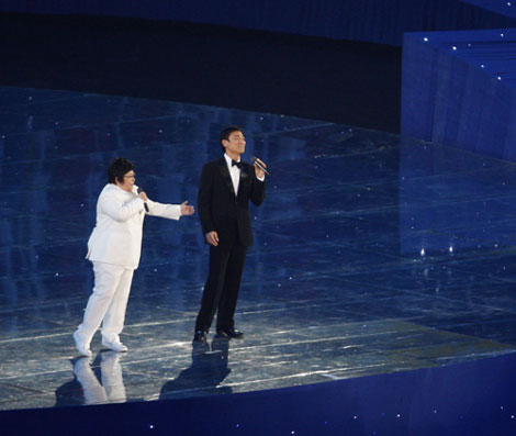 Andy Lau and Chinese singer Han Hong sing the Paralympics theme song "Flying with the Dream” during the Paralympics opening ceremony at the Bird’s Nest in Beijing on September 6, 2008.[Xinhua]