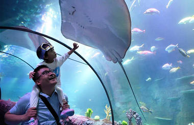 Visitors tour at the Sea Life aquarium center in Chongqing, Southwest China, June 14, 2017. The aquarium center invited citizens with children for a free tour on Wednesday.