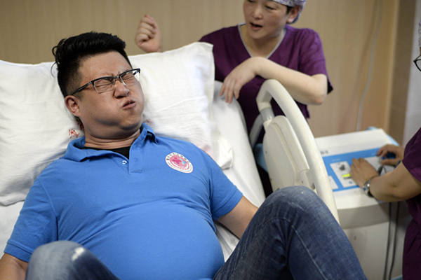 With the Mother's Day around the corner, a hospital in Southwest China's Chongqing municipality offers would-be fathers a chance to experience the pain and stand in their pregnant wives' shoes.