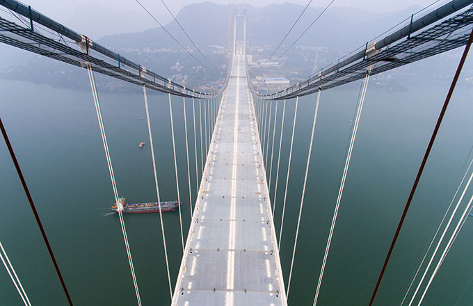 An aerial photo shows the Fuma Yangtze River Bridge under construction in Wanzhou of Southwest China's Chongqing, on Nov 15, 2016.